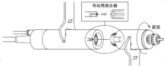 將馬達前部的螺絲對準主軸后部的螺絲朝順時針方向轉(zhuǎn)動。如果旋轉(zhuǎn)傳動用離合器未嚙合時,與馬達連接的螺絲旋轉(zhuǎn)2圈就不能轉(zhuǎn)動,這時,不可用力緊固,將螺絲稍微旋出后用手指轉(zhuǎn)動,使離合器嚙合后再擰螺絲,最后用附帶的27mm扳手緊固。 |