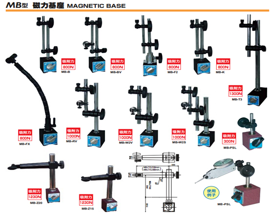 應用:日本KANETEC強力公司專業(yè)生產的MB系列磁性基座機床或鐵平板上,主要對機械加工工件等的尺寸進行比較測量時,如果是以千分尺方式的測量器等進行測量(用以檢測誤差、偏差),本儀器作為測量器夾具得到廣泛使用。