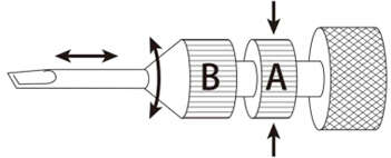 用手指按住到頭安裝的A部分,續(xù)傳B部分,刀頭就能很輕松的拆卸下來。 |