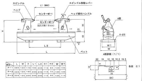 型號 | 臺長(㎜) | 臺寬(㎜) | 臺高(㎜) | 中心距(㎜) | 可測直徑(㎜) | 臺面平行度 | 臺面/中心測定面平行度(μ) | 中心頂針/測定面平行度 | 使用 | 重量 |