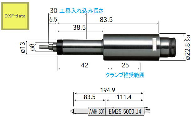 AMH-301 | Φ22.8mm | 30,000 min-1 | 2μm以內(nèi) | 夾頭(CHM系列) : 1.0~3.0mm | 370g |