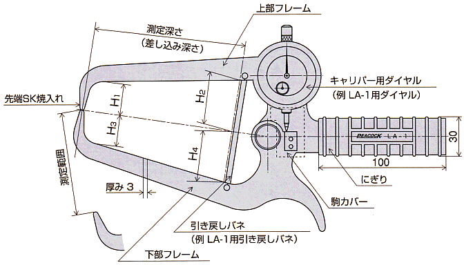 孔雀peacock帶表外卡規(guī)LA-11,測(cè)量范圍0-50mm,測(cè)定喉深125mm,最小讀值0.1mm.適用于中央凸起的外徑測(cè)量。peacock代理商春亨工具。