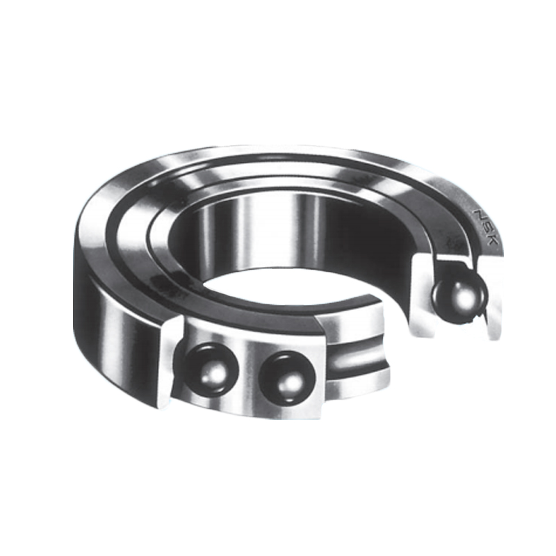 單列角接觸球軸承-這種結(jié)構(gòu)形式的軸承,可以承受徑向載荷和單向的軸向載荷。球與內(nèi)圈、外圈有15度、25度、30度或40度的接觸角。其接觸角越大,軸向載荷的承受能力越大。接觸角越小,則約有利于高速旋轉(zhuǎn)。通常,將二套軸承對(duì)置,調(diào)整內(nèi)部游隙后使用。一般,采用鋼板沖壓保持架,但接觸角小于30度的高精度軸承,主要使用聚酰胺形成保持架。